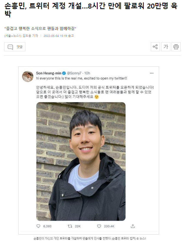 손흥민 트위터 개설 8시간 뒤 팔로워