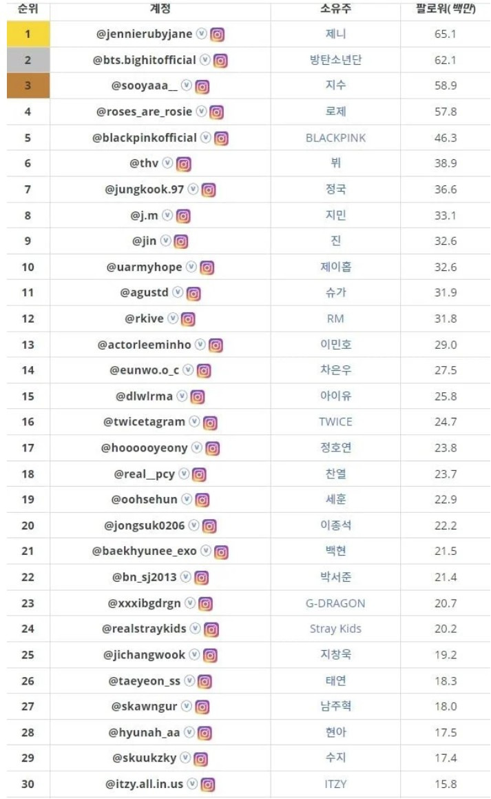 한국연예인 인스타 팔로워 상위 30인