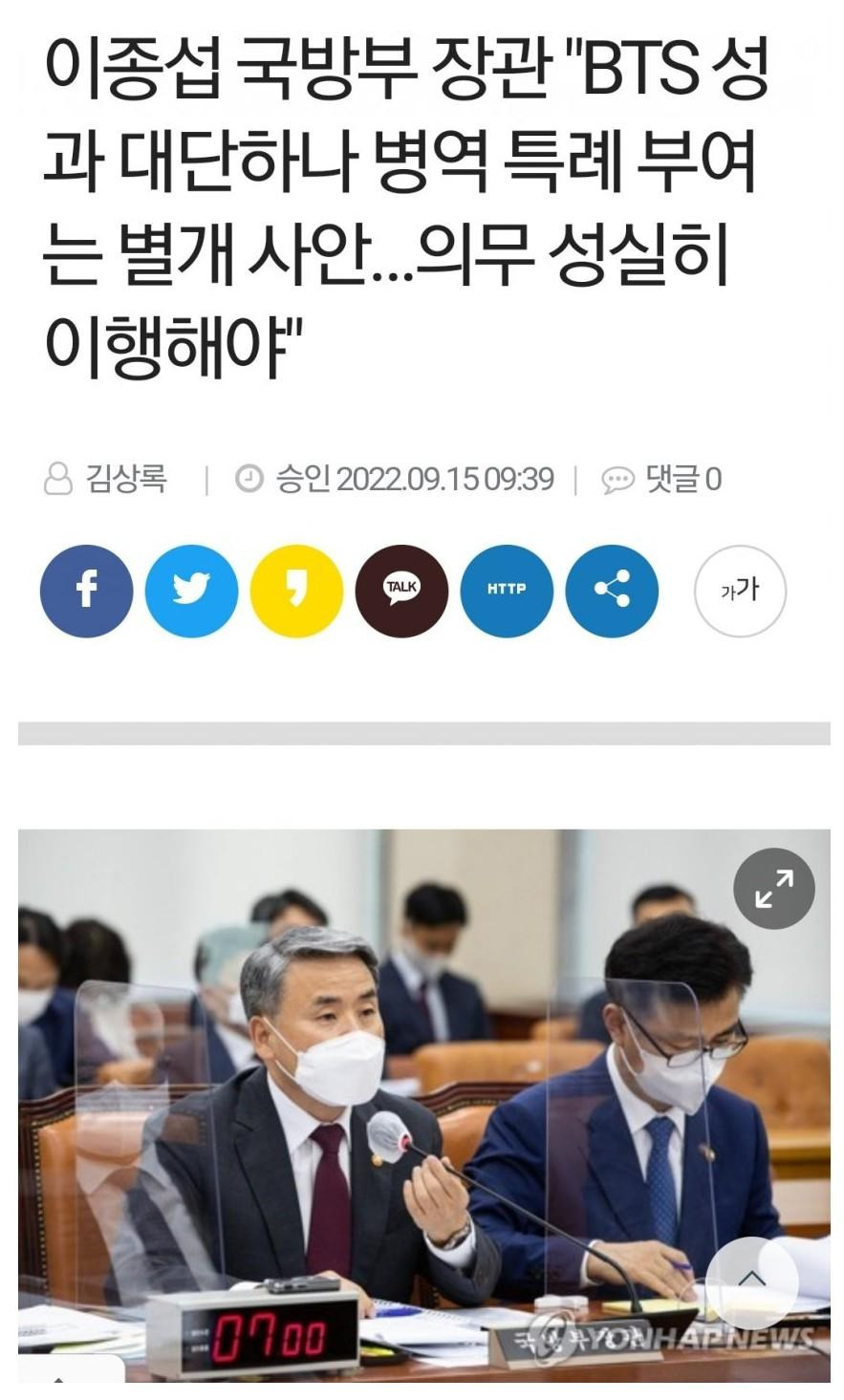 BTS 또한 병역의무를 성실히 이행해야 한다는 국방부의 기본 입장은 변함없다"고 말했다