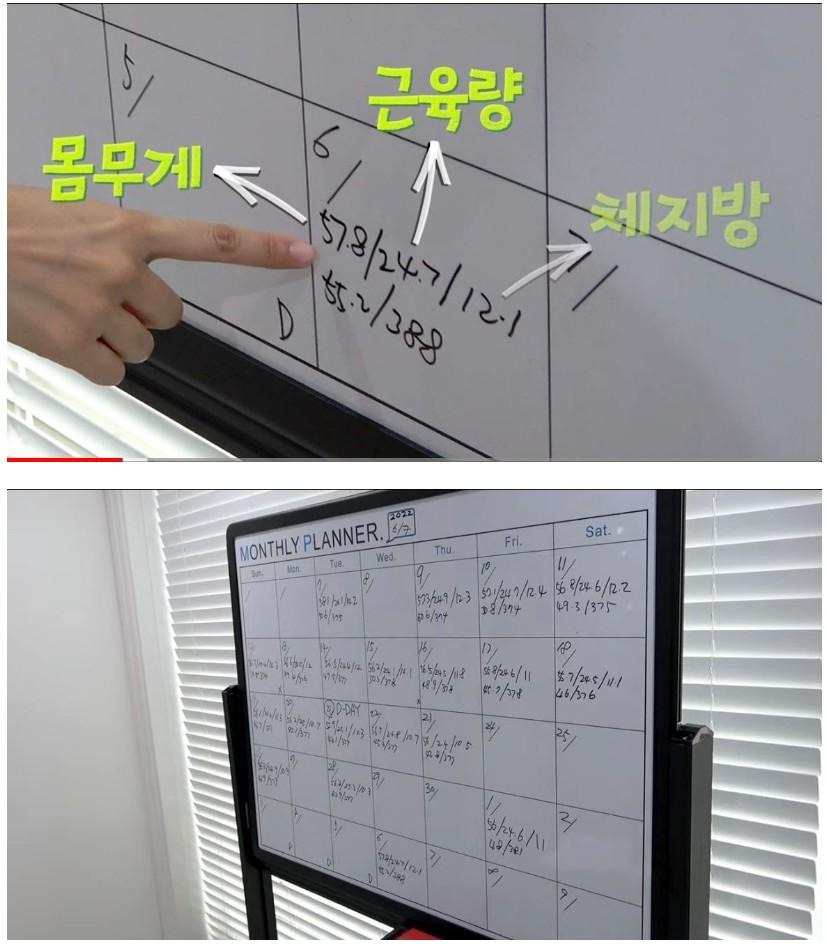 새벽에 일어나자마자 나체로 인바디 찍고 화이트보드에 다 기록함