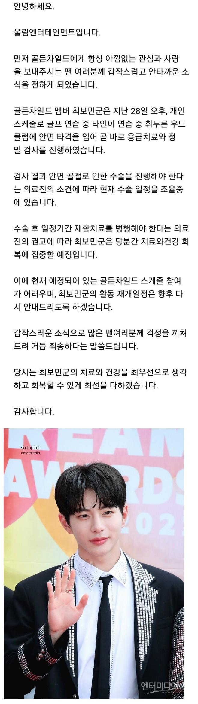 골프 연습 중 안면골절 당한 아이돌