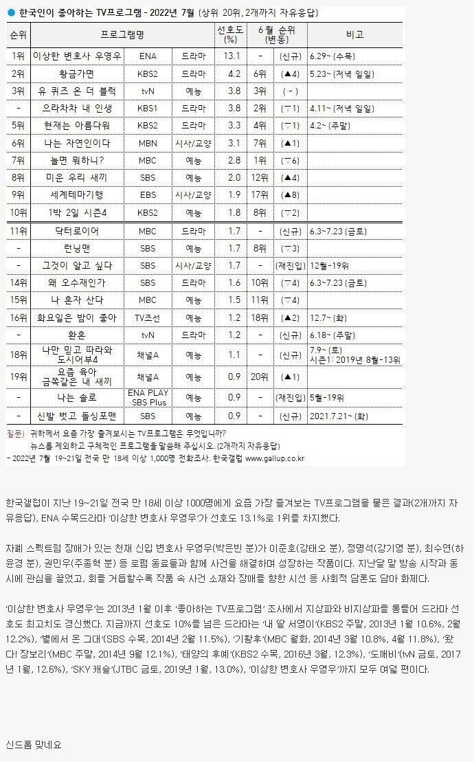 '우영우' 갤럽 역대 최고치 경신 본문 0 피클연예 목록 EVENT) 지금 로그인 후 광고 제거 혜택을 받으세요! TIP) 초승달 아이콘을 누르고 어두운 화면으로 전환 해보세요 TIP) 본문 하단 무지개 로켓을 누르고 시간 여행을 떠나보세요 TIP) 빈 공간을 두 번 누르면 맨 아래로 바로 갈 수 있어요 TIP) 편지 아이콘이 무지개 빛으로 빛난다면 쪽지가 온거에요 TIP) 본문 하단 댓글 온/오프 버튼으로 숨기거나 펼칠 수 있습니다 현재 서울한파 체감시키는 기상캐스터 26.01.04 720 매니저한테 갑질해도 논란 없는 연예인 26.01.04 1111 트와이스 데뷔 땐 제일 별로였는데 요즘은 얘가 이뻐보임 26.01.04 1141 요즘 SNS 유행하는 가난밈에 개빡쳤다는 신화 김동완 26.01.04 654 흑백2 때문에 퇴사 고민 중이라는 디씨인 26.01.04 715 흑백요리사 급호감 3인방 26.01.04 468 임성근 셰프 식당 관련 오피셜 26.01.04 470 나이키가 생각하는 T1 페이커 26.01.04 533 열린1페이지 2페이지 3페이지 4페이지 5페이지 6페이지 7페이지 8페이지 다음 맨끝 게시물 검색 검색대상 제목 내용 제목+내용 댓글작성자 검색어 필수 삭제요청