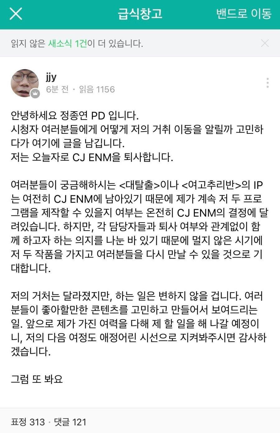 [속보] '대탈출' 정종연 피디... CJ tvN 퇴사