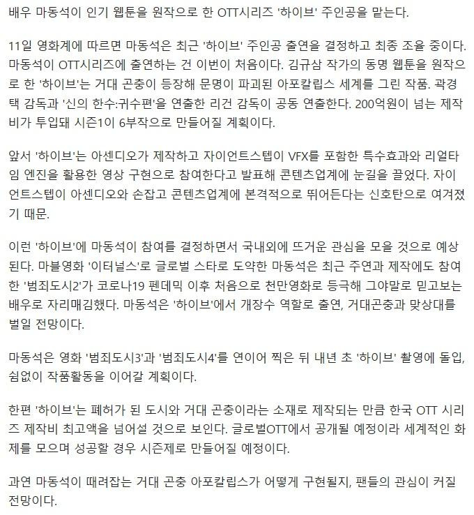 오피셜) 웹툰 '하이브' 실사화 주인공 확정