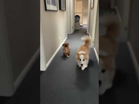 짧은 다리 코기 놀리는 강아지