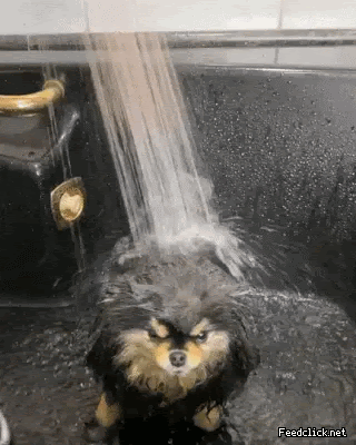 폭포에서 심신 단련하는 강아지