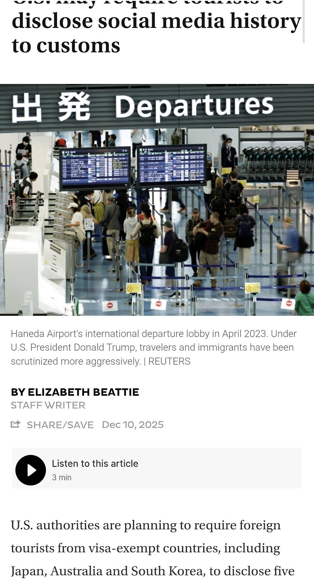 미국 '선진국도 입국시 sns 5년간 내역 제시'