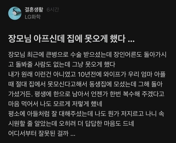 장모님 아프신데 집에 못 오게 했다