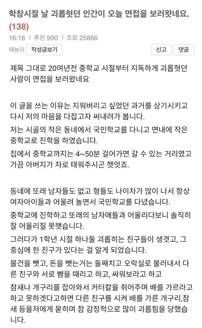 학창시절 절 괴롭힌 인간이 면접 보러 왔네요