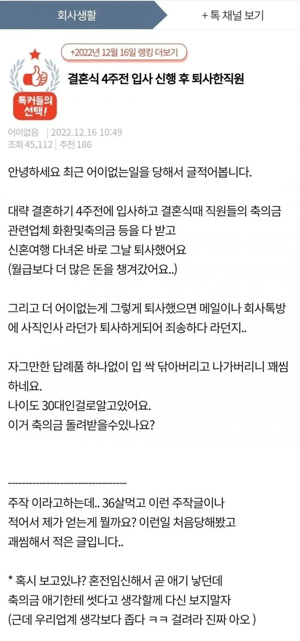 결혼식 4주 전 입사 신혼여행 후 퇴사한 직원