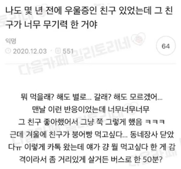 우울증 심해진 친구에게 잠깐 걷자고 했다