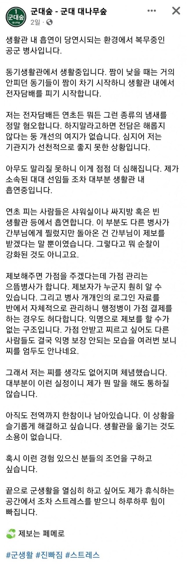 생활관 내 흡연한다는 요즘 군대