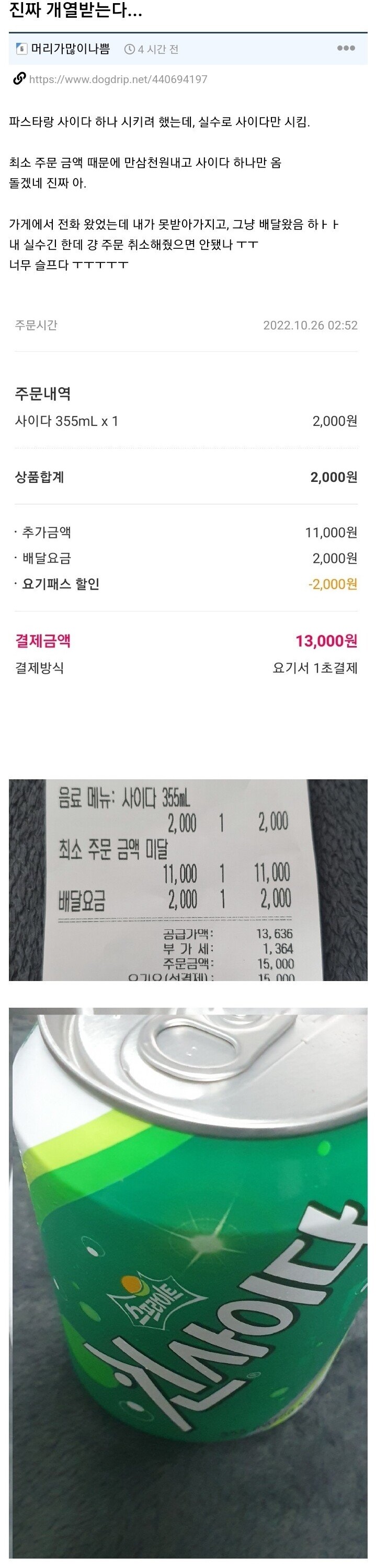 음식을 시켰는데 사이다 하나만 옴