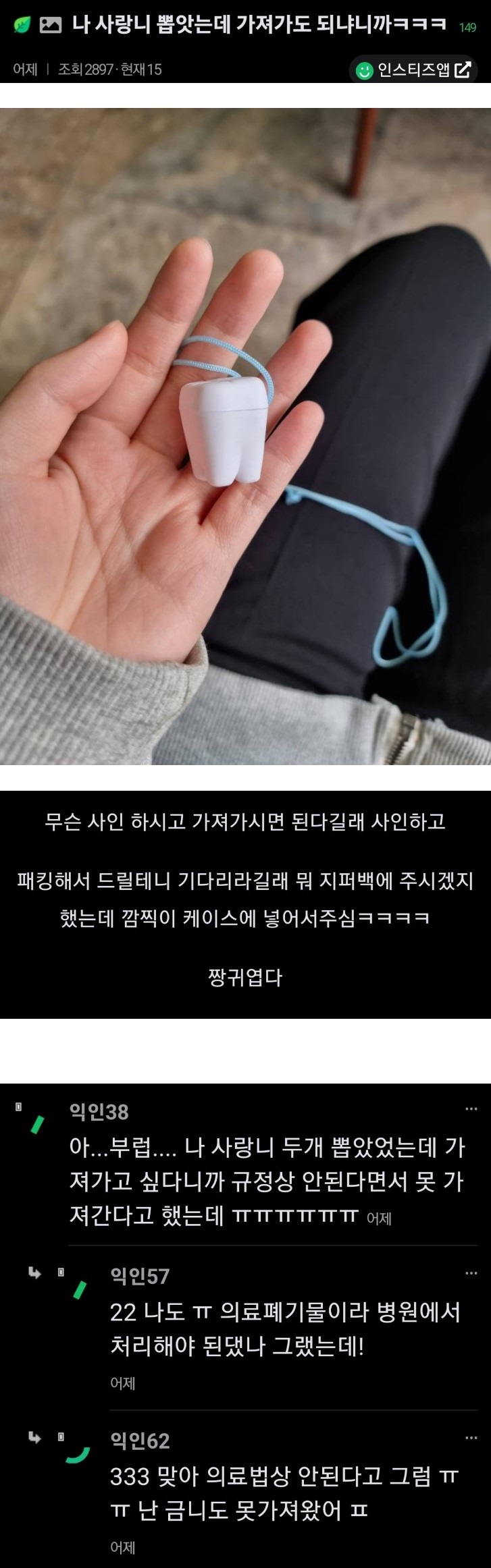 사랑니 뽑았는데 가져가도 되냐니까...