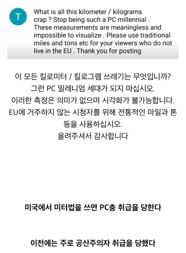미국 유튜버가 미터법 사용하면 받는 댓글