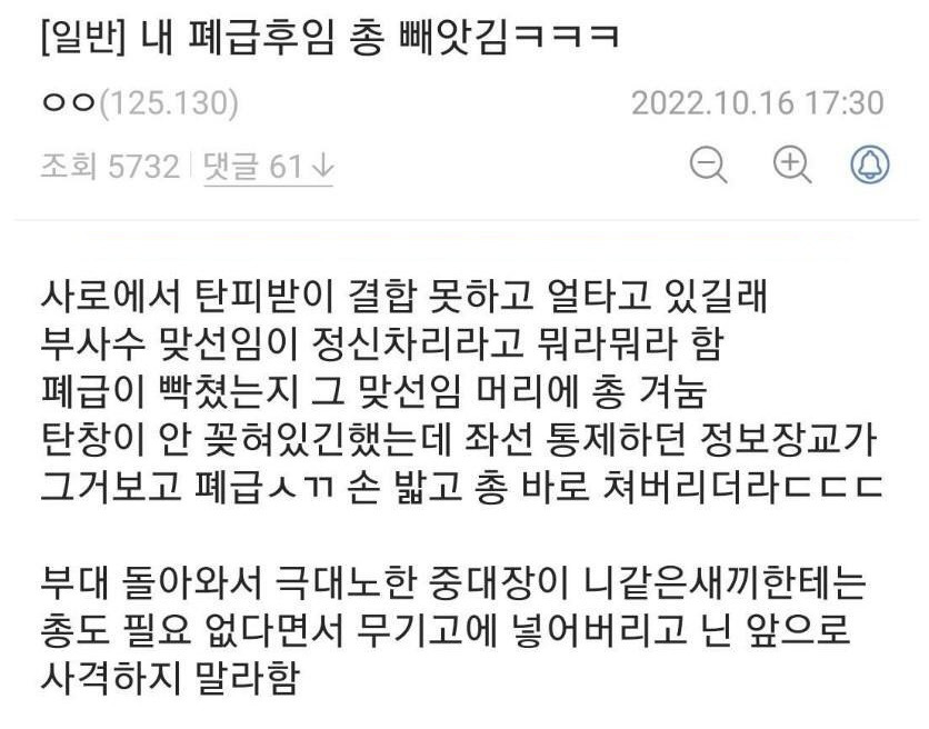 우리 부대 폐급 후임 총 빼앗김