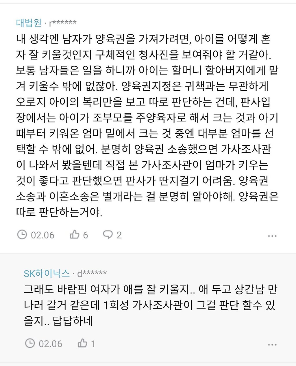 결혼하고 애까지 있는 사람이 바람 폈으면 양육권 박탈은 당연하고 교도소에 집어넣는게 맞다고 생각하는데 이 나라 법은 대체;;