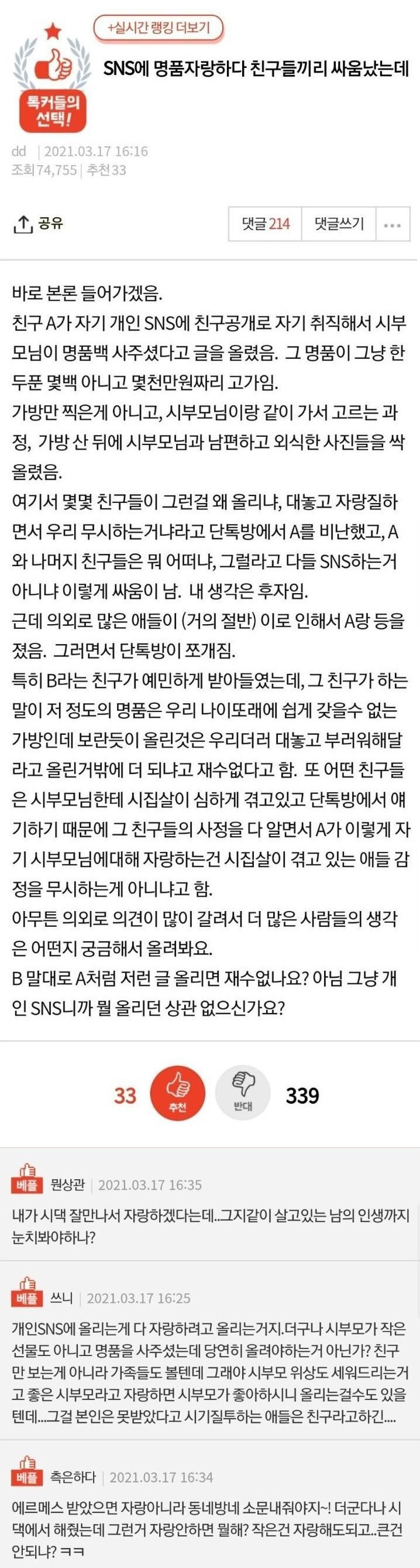 SNS에 명품 자랑하다가 친구들끼리 싸움 남