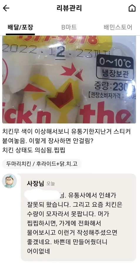 치킨무 같은 소모품은 웬만큼 장사가 안되는 집이 아닌 이상 재고가 쌓이지 않는 제품이기 때문에 신빙성은 있지만 싸가지가 없네.