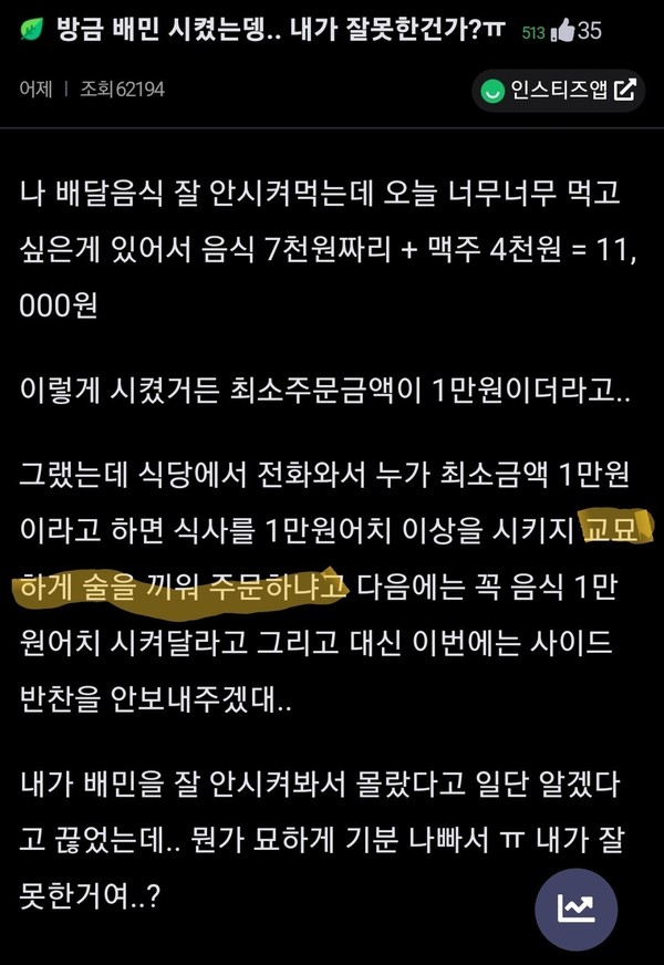 배달 최소 주문 금액 간신히 넘기면 듣는 말
