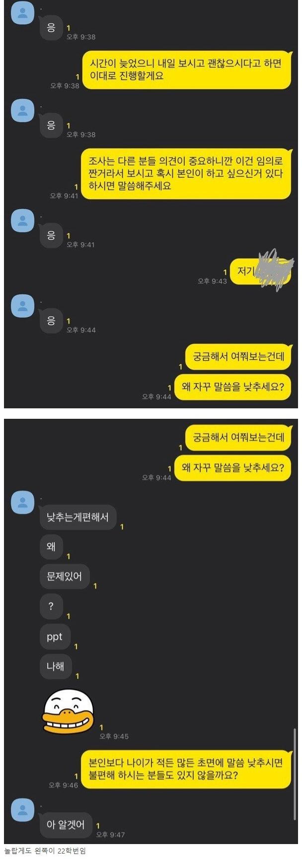 조별과제 22학번과 17학번의 카톡