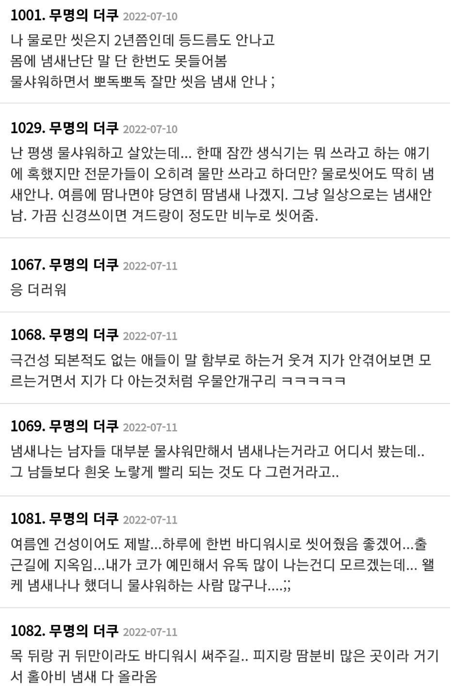 본인이 그러면 남들도 같을거라고 생각하는 애들이 꼭 눈감고 귀닫고 빡빡 우김ㅠㅠ 니가 물샤워만 했을 때 냄새나는 이유는 니 피부가 존나게 기름진 타입이란 뜻이야.. 세상엔 안그런 사람들도 많단다