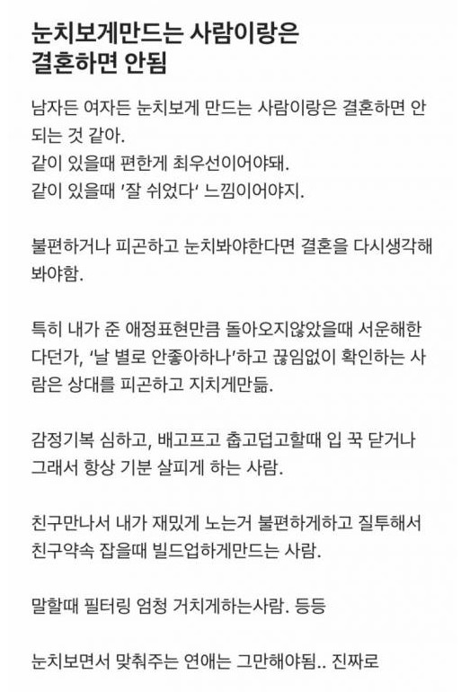 눈치 보게 만드는 사람이랑 결혼하면 안됨