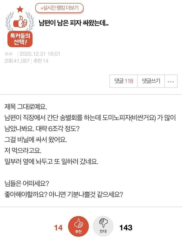 회사에서 남은 피자 싸온 남편