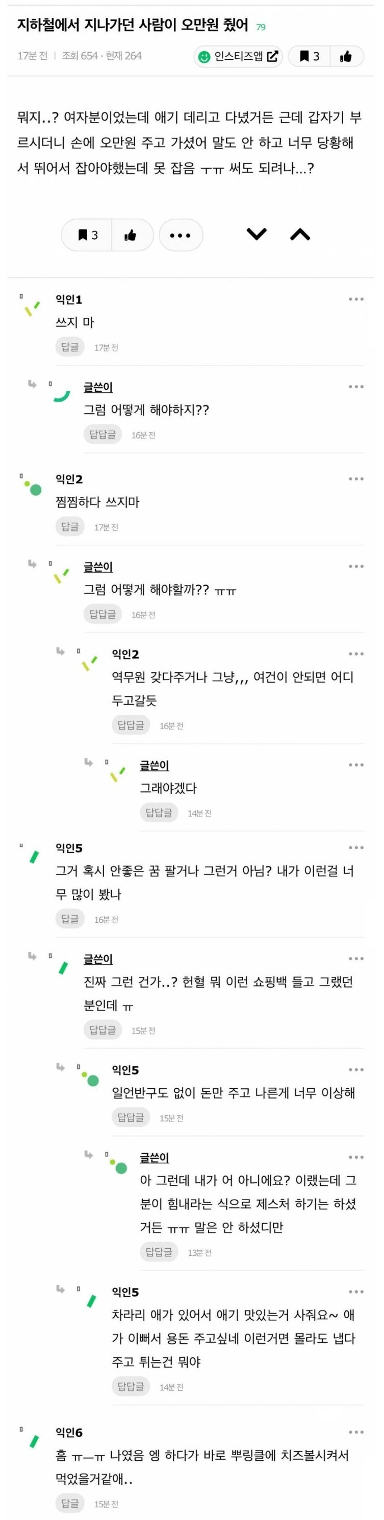 지하철에서 지나가는 사람이 오만원 줬어