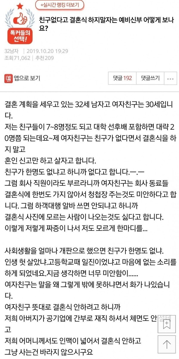 친구 없다고 결혼식 하지 말자는 예비 신부