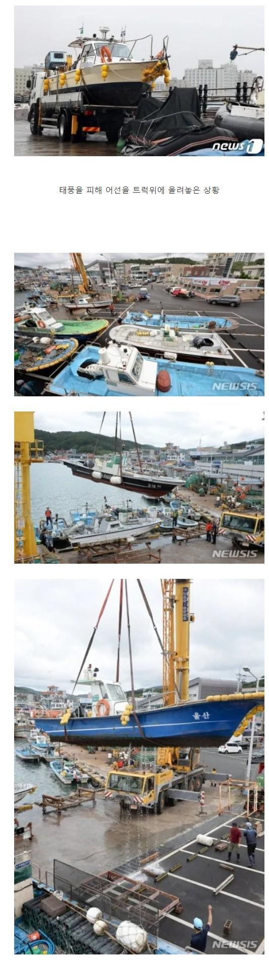 울산 북구 정자항에서 어민들이 태풍을 피해 소형 어선들을 육지로 옮기고 있다