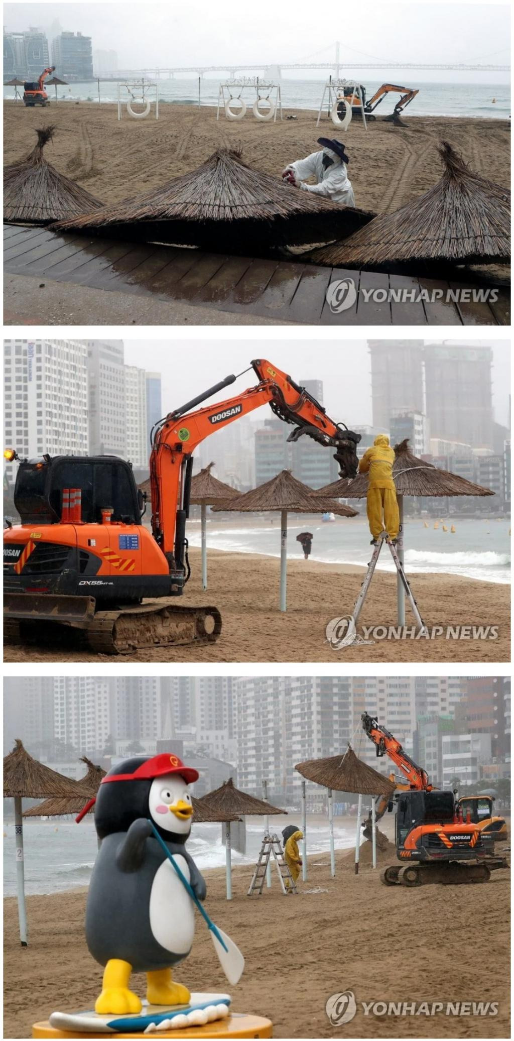 부산 광안리해수욕장에 설치된 파라솔이 철거되고 있다