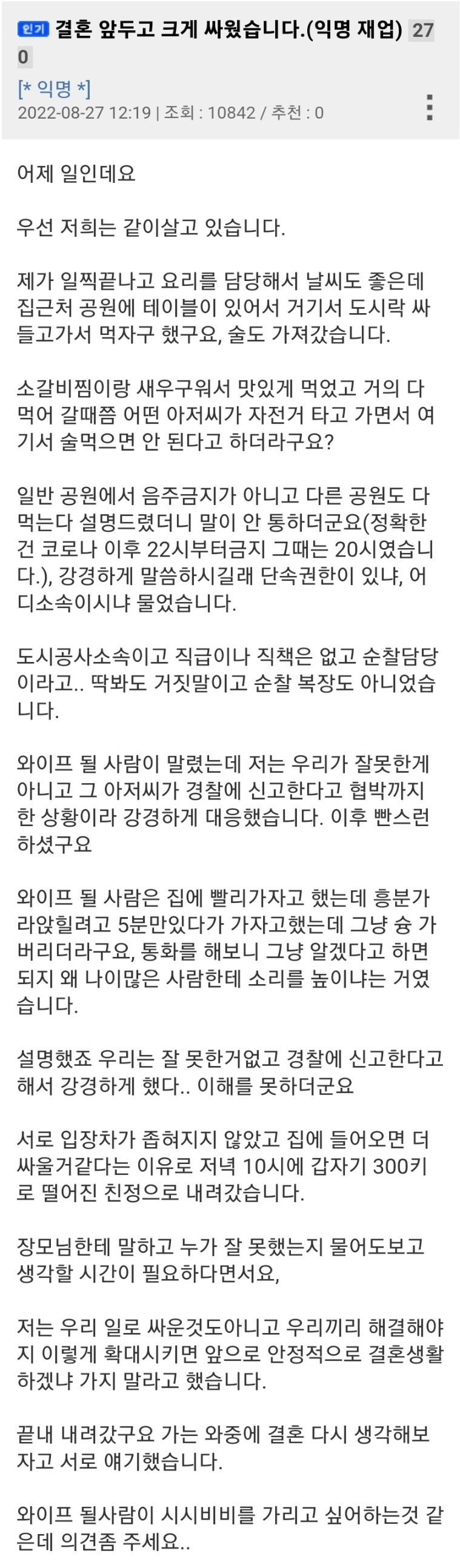 공원에서 술 마시다 파혼 위기 온 사람
