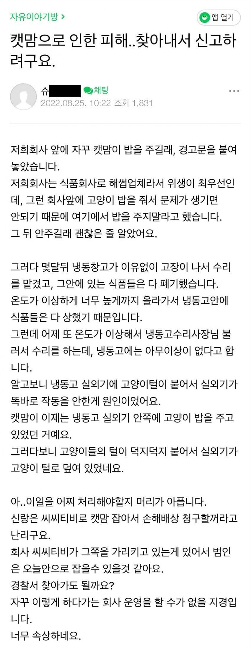 캣맘의 악행으로 운영 못하게 된 식품 업체