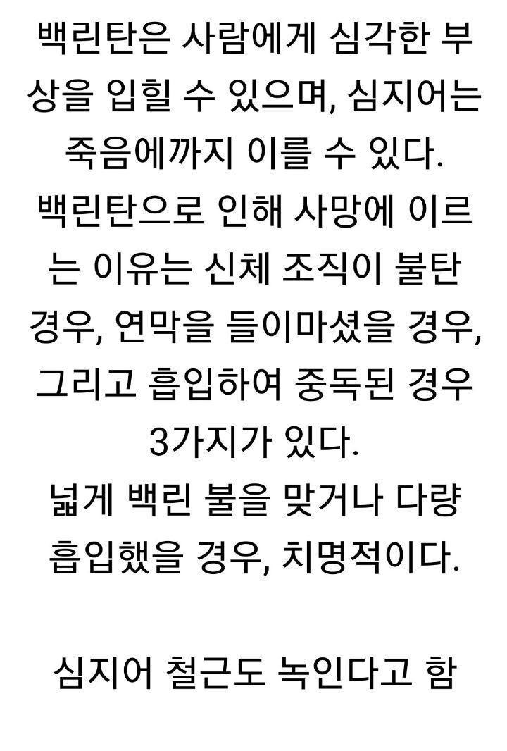 백린탄... 산소에 반응해서 3천도까지 오른다고 들었습니다. 물에는 반응하지 않지만 물 밖으로 나와 산소와 만나면 다시 3천도까지....