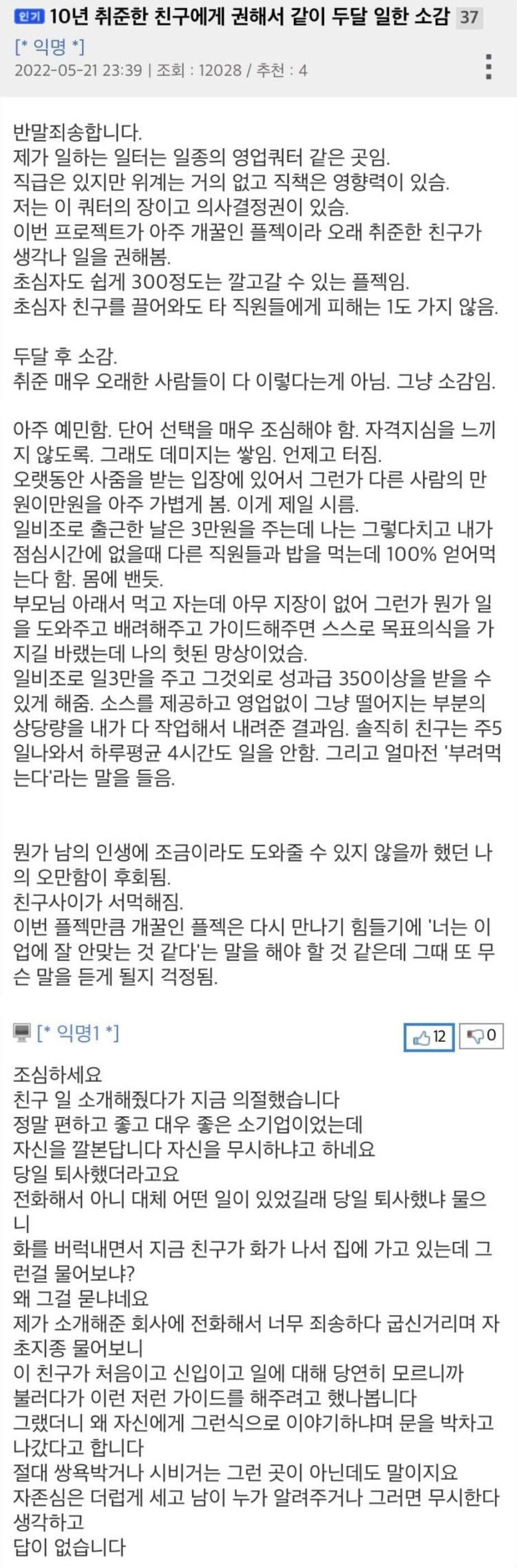 10년 취업 준비한 친구와 같이 일한 소감