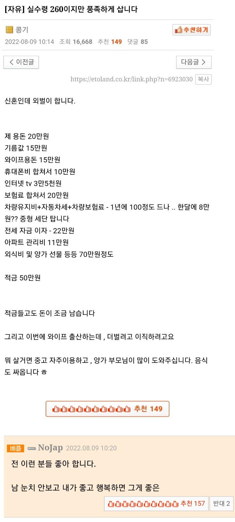 외벌이 실수령 260으로도 풍족하다는 부부