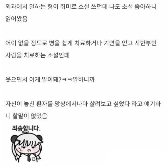 의사 사촌형이 취미로 쓴 소설을 읽어봤는데