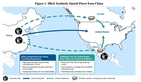 오피오이드(아편계 마약성 진통제) 계열 유통맵인데 중국이 원산지라함