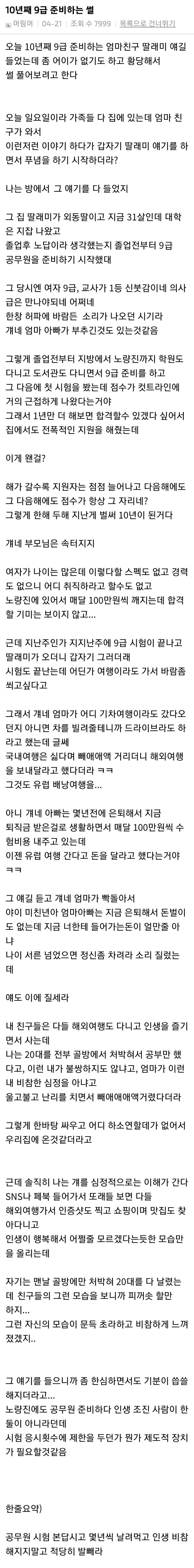 10년째 9급 준비하는 엄마 친구 딸내미 썰