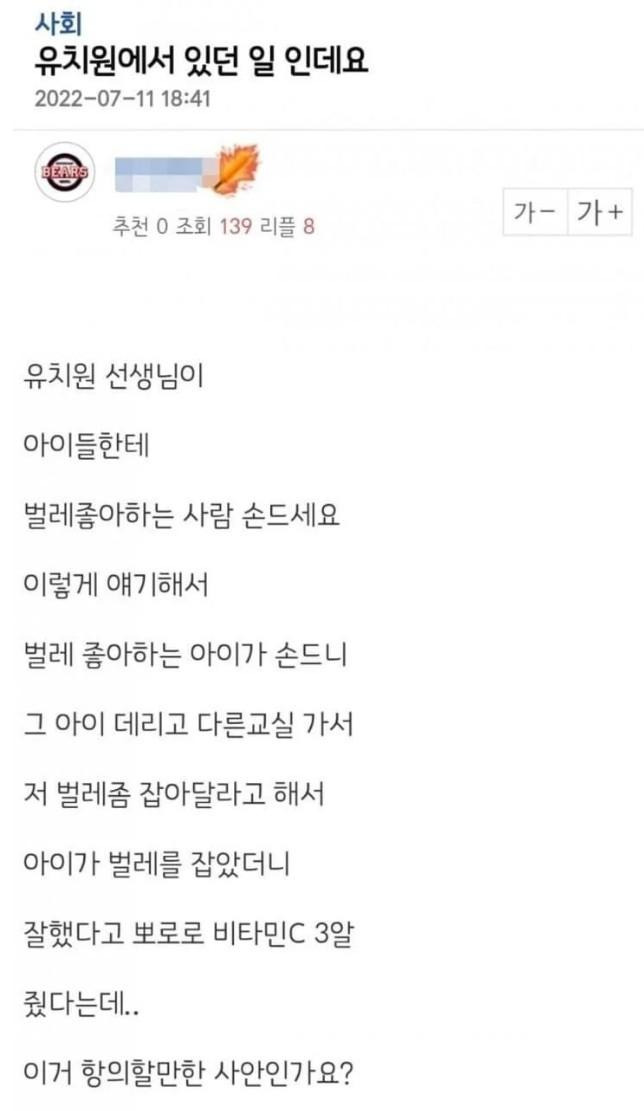 애들한테 벌레 잡아달라고 한 유치원 선생님