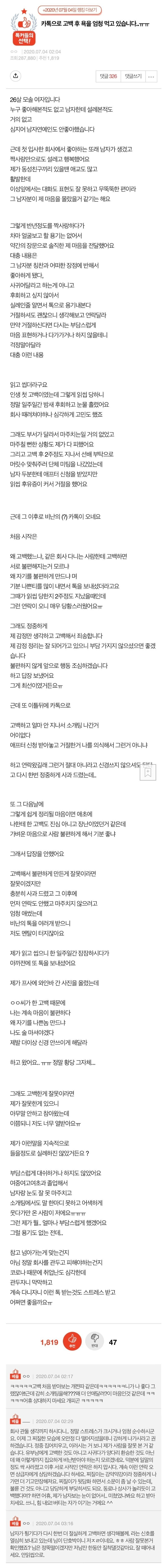카톡으로 고백 후 욕을 먹고 있습니다