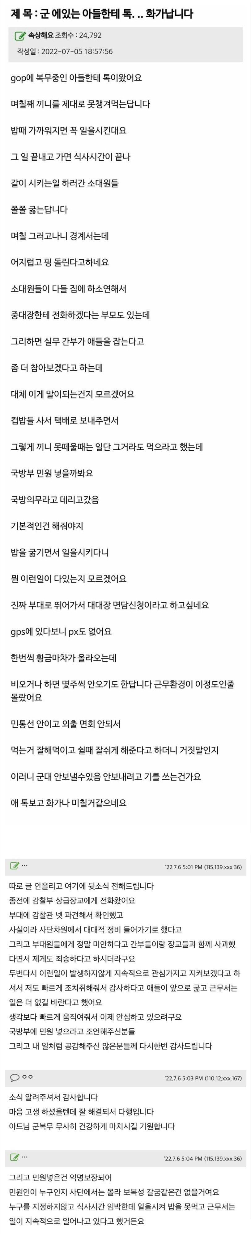 군대에서 아들 밥을 안 먹인다네요