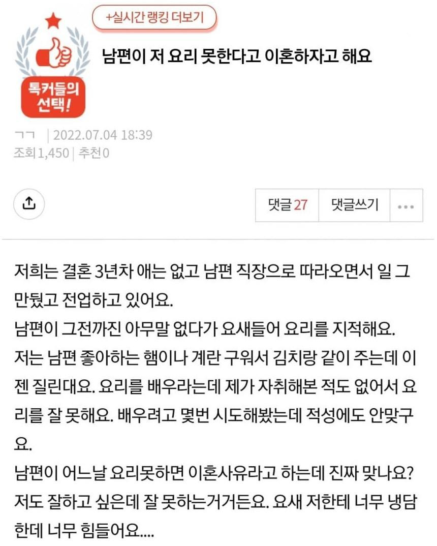 요리 못한다는 이유로 이혼하자는 남편