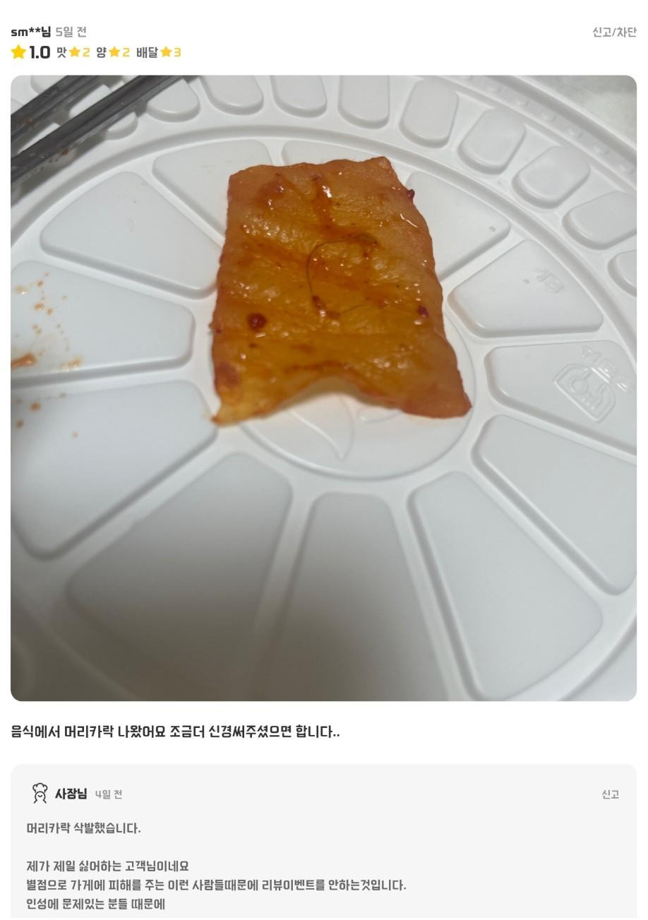 음식에서 머리카락 나왔어요