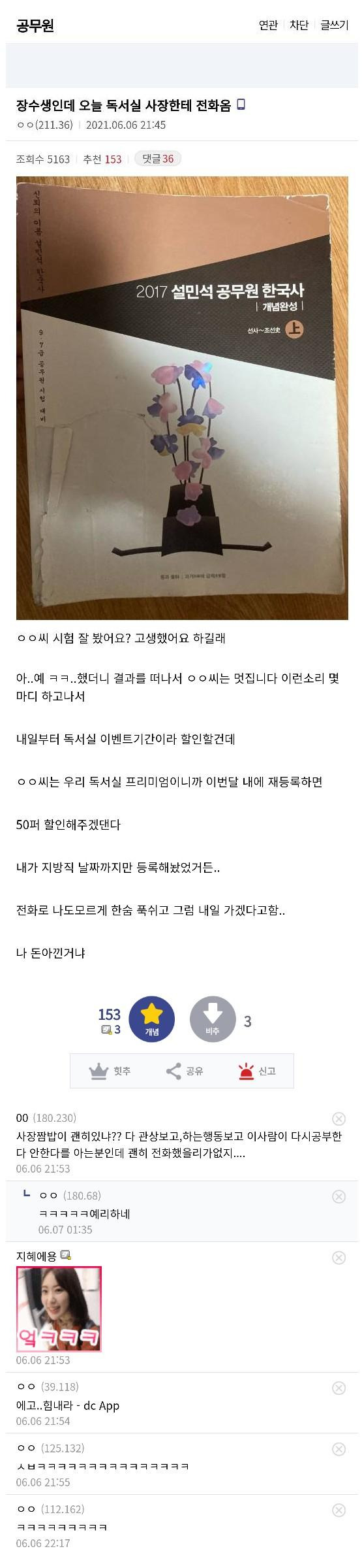 장수생인데 최근 독서실 사장한테 전화옴