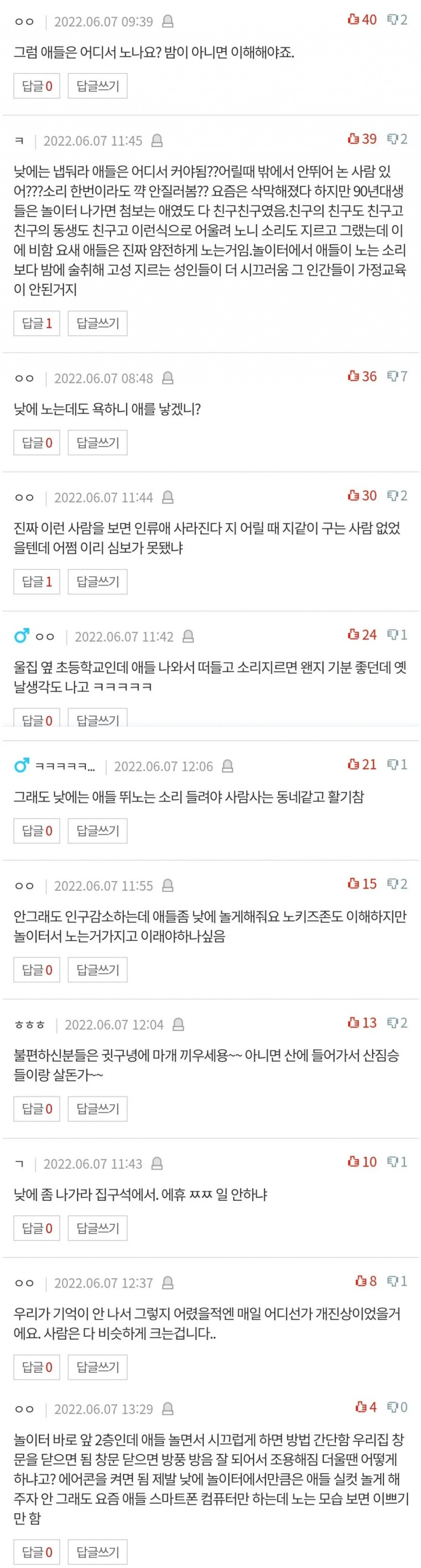 놀이터라고 해도 밤 시간대까지 시끄러운건 문제겠지만 낮인데 그건 이해해줘야지