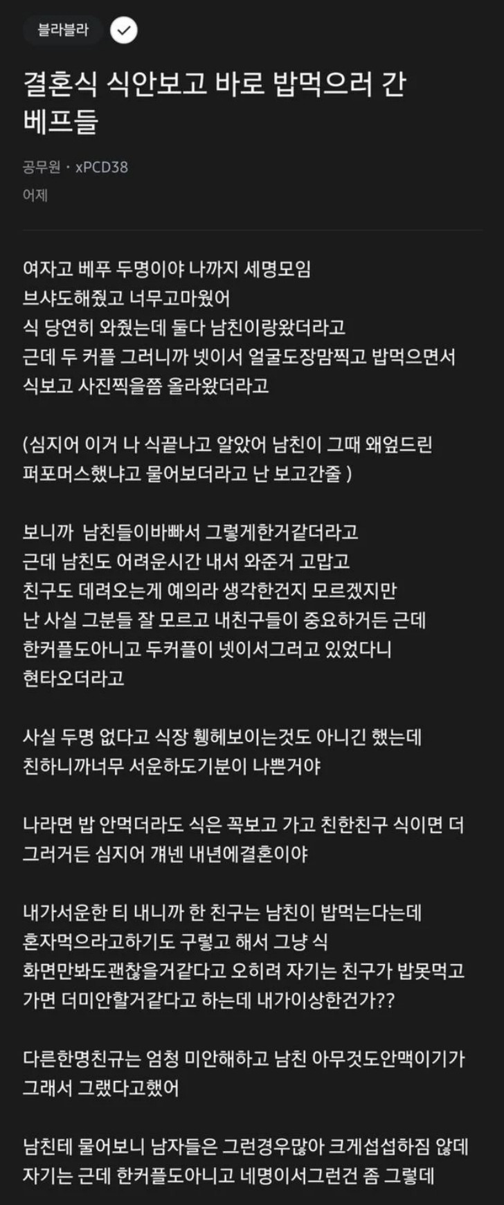 결혼식 식 안보고 바로 밥 먹으러 간 베프들