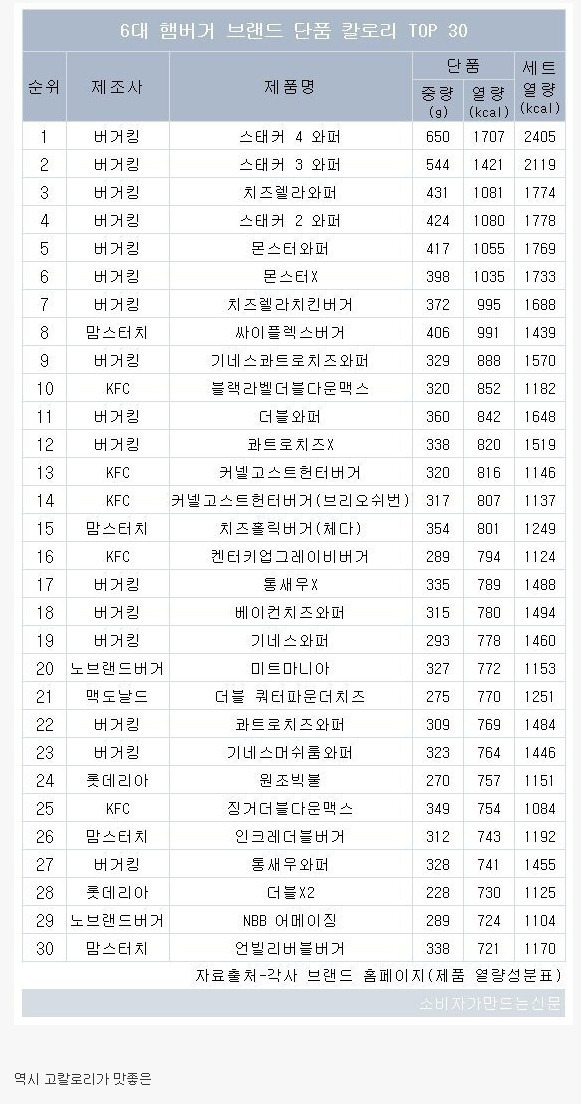 모든 브랜드 햄버거 칼로리 순위