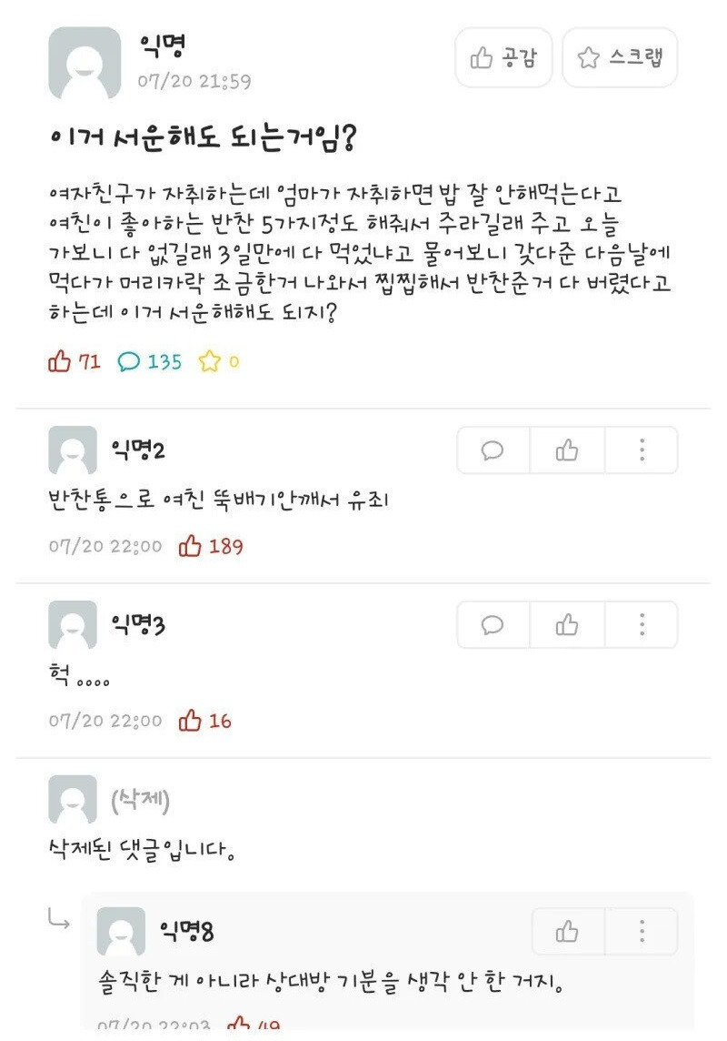 남친의 집 반찬을 먹은 여친 반응